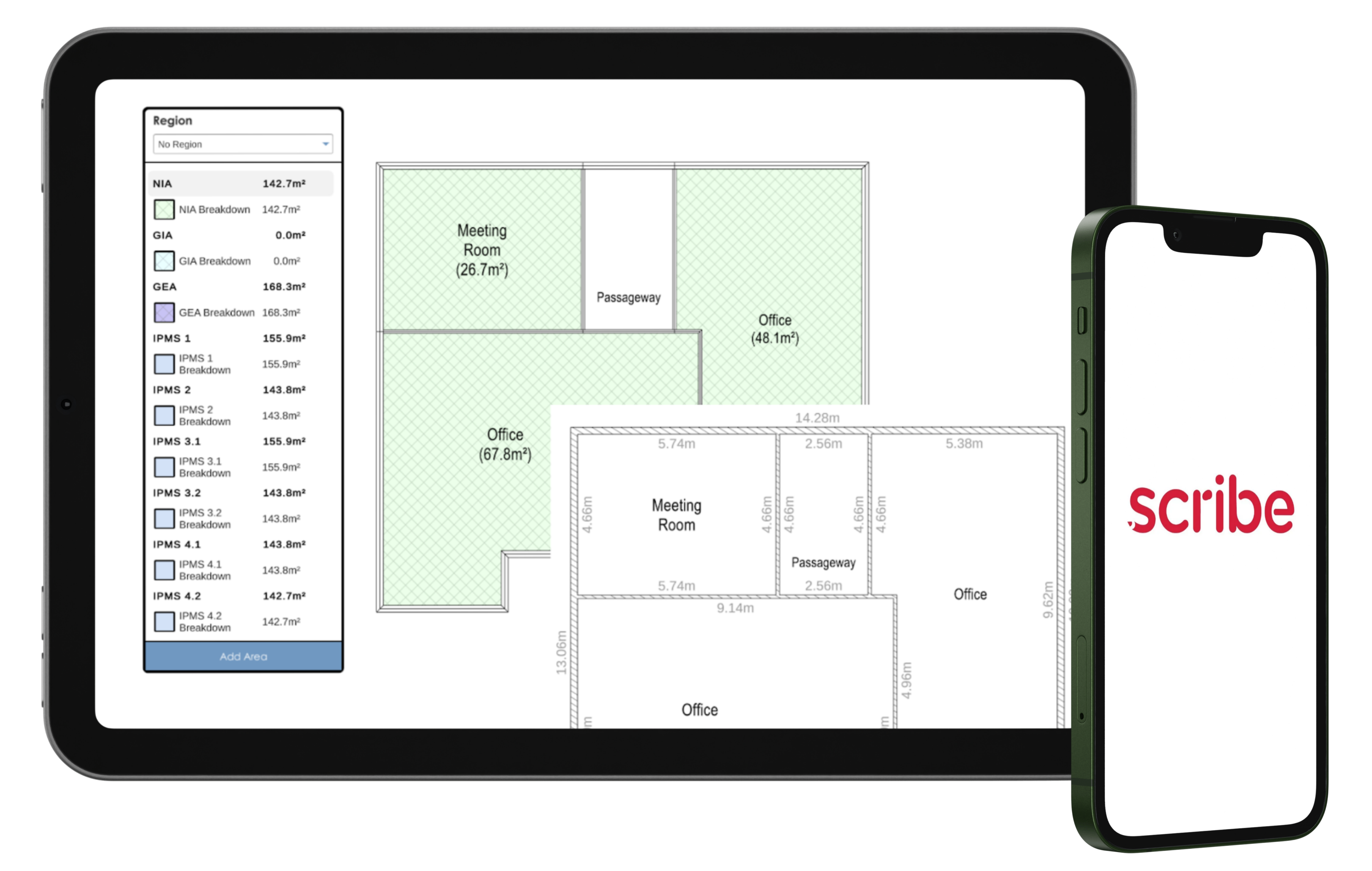 Scribe can undertake multiple simultaneous automatic area calculations.  For example Scribe can calculate the NIA and GEA of a building at the same time.  All areas are exported to a hosting application or downloaded from our portal.  You can configure exactly how you want the areas to be calculated.  Scribe can handle any measuring code of practice.
